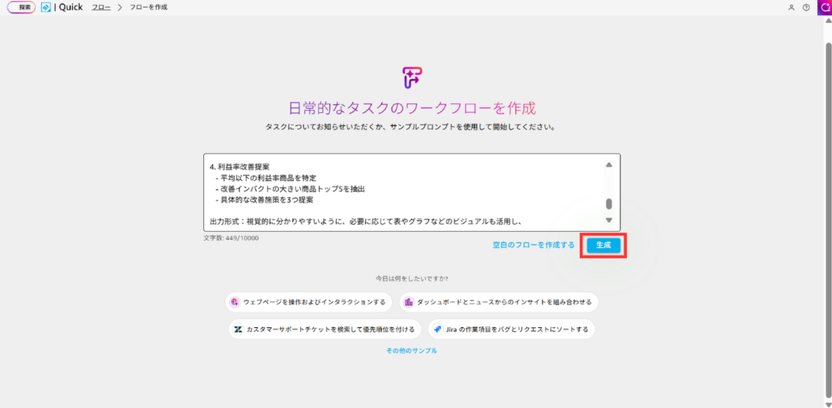 プロンプトを入力すると、AIが指示内容を解釈し、自動的にワークフローを組み立てます。
