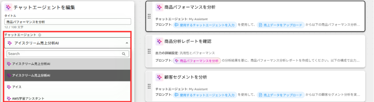 作成したチャットエージェントを選択することもできます。
