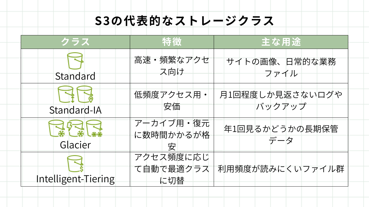 S3には、保存するデータの種類や用途に応じて選べる「ストレージクラス」という仕組みがあります。