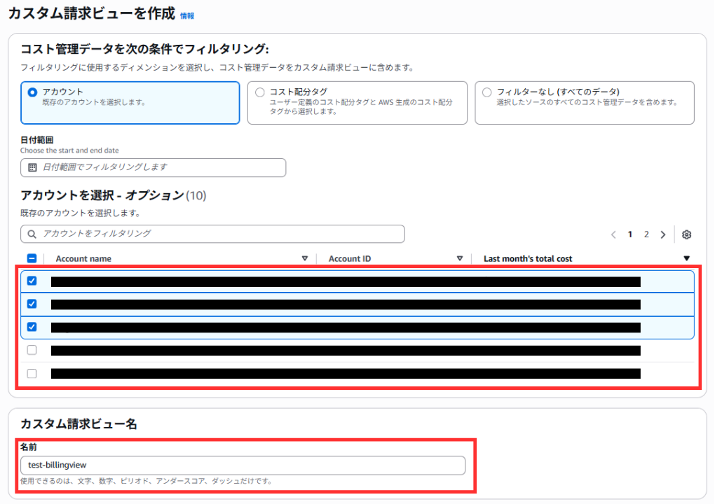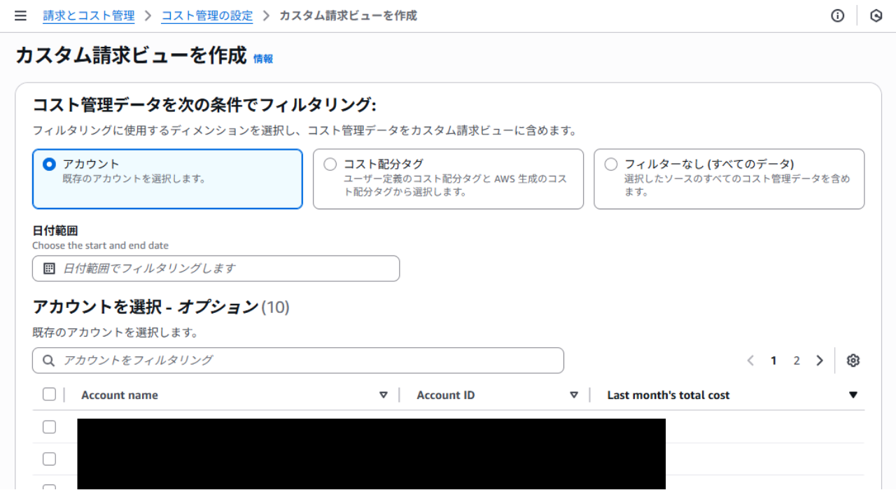 どのOrganizations/アカウントのコストデータを含めるかを指定