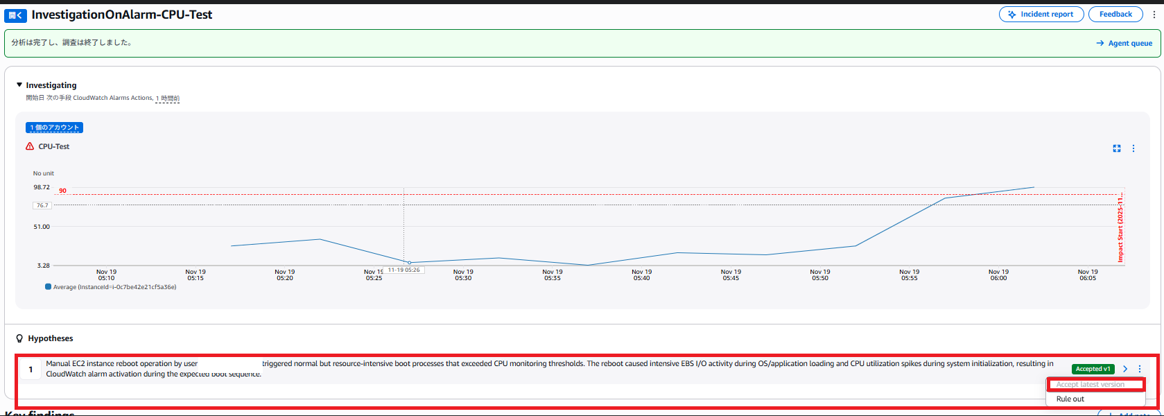「 Hypotheses」(仮説)で今回のアラートの原因を確認し、「 Accepted 」(承認)をクリックする