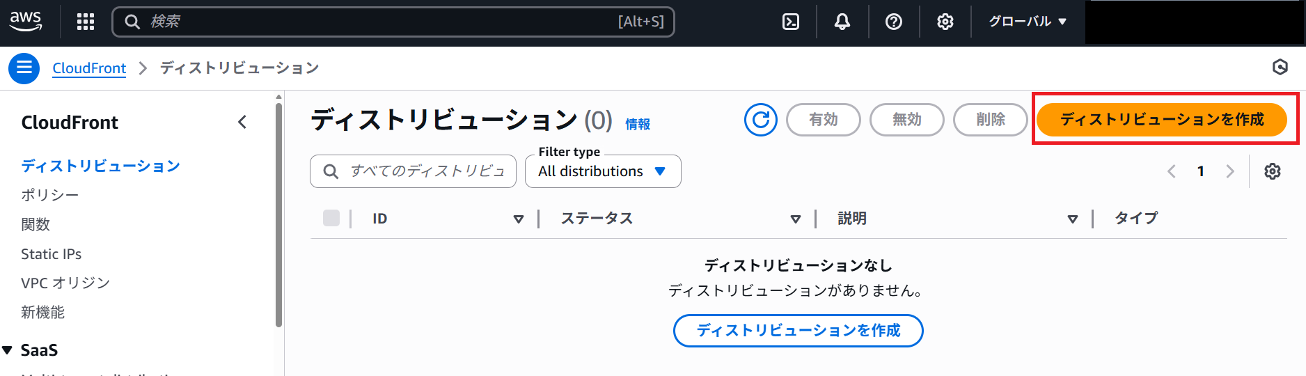 ②「ディストリビューション」から「ディストリビューションを作成」をクリック