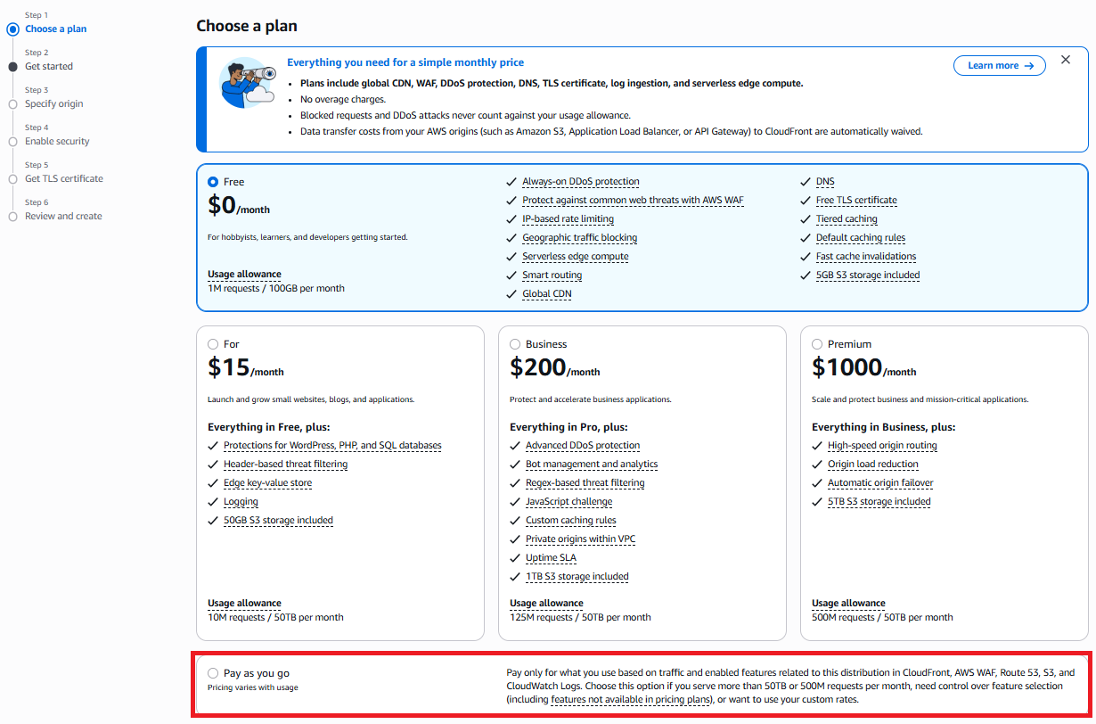 このプランは Amazon CloudFront を中心に、複数のAWSサービスを組み合わせて提供されます。ウェブサイトやアプリが急にアクセス増加したり、DDoS攻撃を受けても、安心の月額料金で利用できます。
