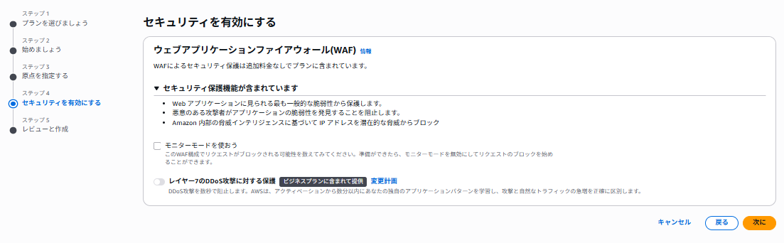 ⑥ WAFは追加料金なしの場合は、デフォルト設定が適用される