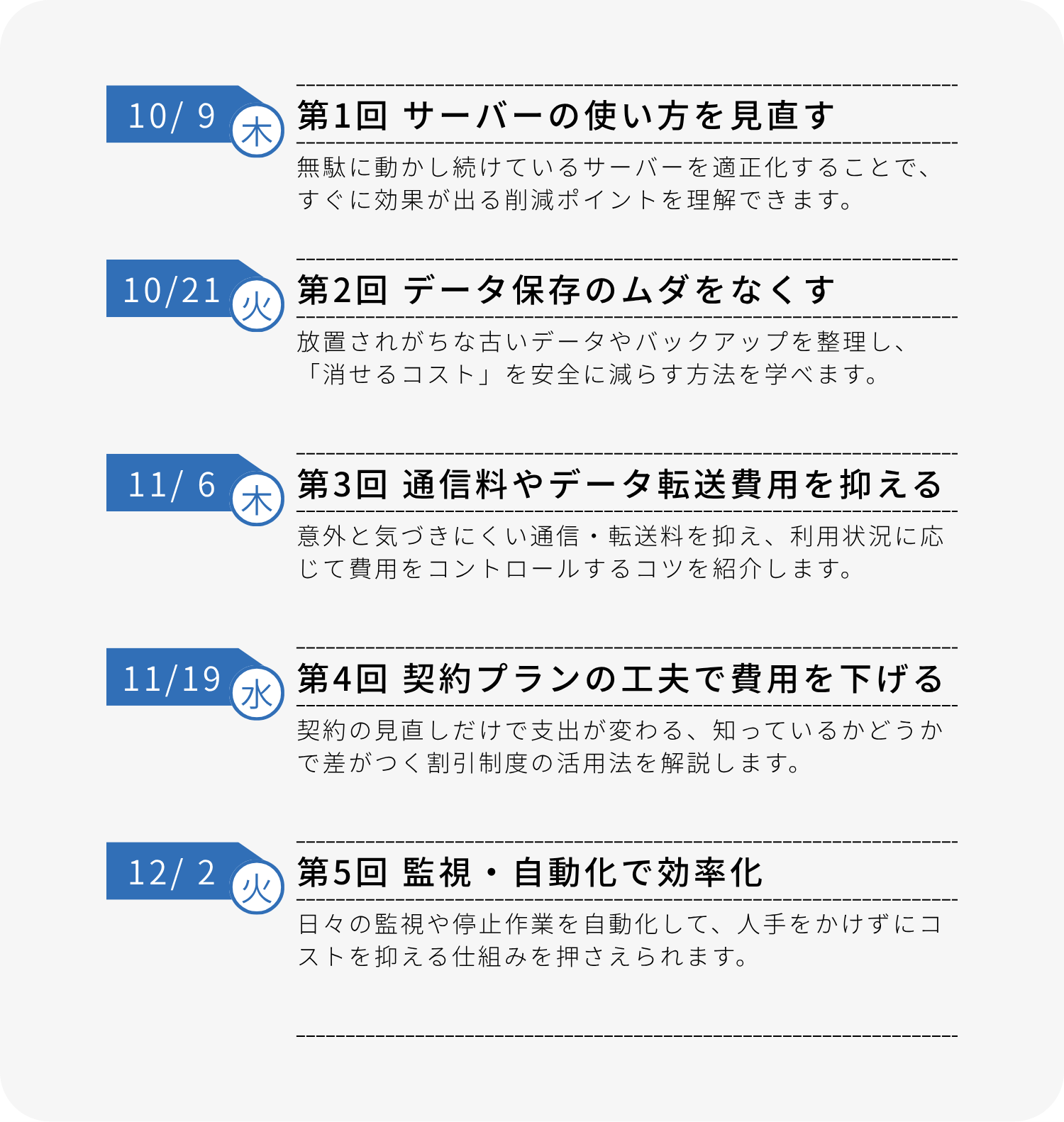 そこで本ウェビナーでは、AWSの主要なコスト領域ごとに代表的な削減策を取り上げ、全5回シリーズで計20のポイントを解説します。
